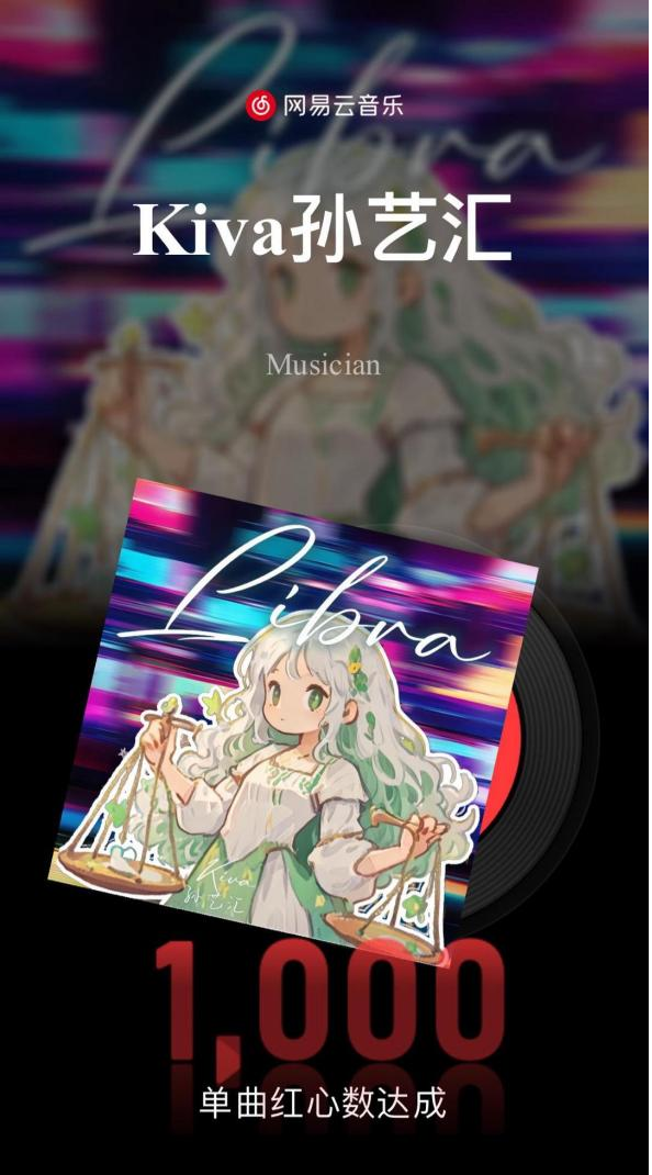 她的个人原创曲目Libra(天秤座),在网易云单曲红心数达成1000枚